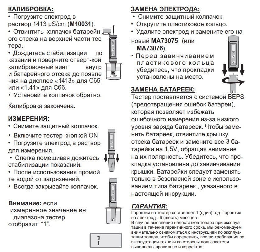В комплекте: 1413 µS/cm калибровочный раствор (емкость 20 мл), батарейки, отвертка